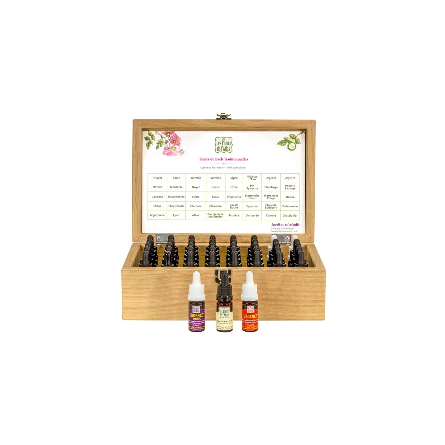Kit des 38 Fleurs de l'Atlas® + 2 Urgences présentées dans une boite en chêne faite à la main de fabrication Française. Il a été créé et réalisé à notre demande par Mathieu Lasserre.